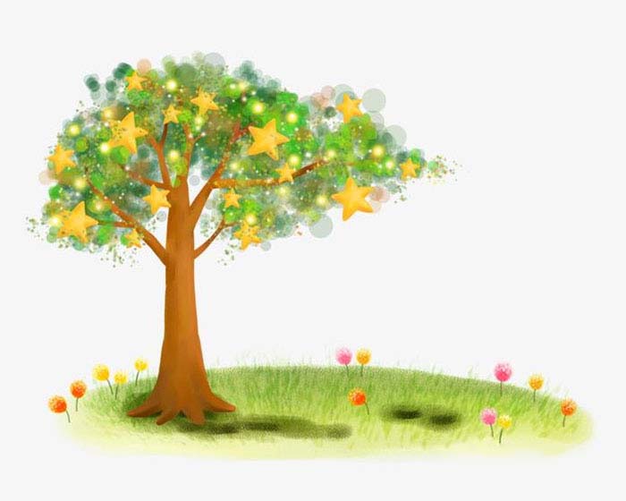 忽然,眼前出现一道闪光——银色的星形小芽破土而出,小芽噌噌地向上蹿,眨眼间长成一棵银色闪光的大树啦。大家还来不及赞叹,更神奇的事情发生了。树枝上结出一颗颗星星形状的果子,亮亮的,闪闪的,漂亮极了!